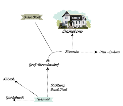 Wegweisung “Insel Poel” folgen bis “Groß Strömkendorf”. Dort vor dem Gasthof “Schäfers Eck” rechts abbiegen Richtung “Blowatz”. In Blowatz links abbiegen nach “Damekow”.